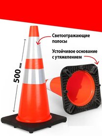 Конус дорожный 500 мм с утяжелителем, резиновое основание, 2 светоотражающие полосы, 500*280*280 мм, вес 1,5 кг.