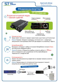Медиаконвертер ST-MC1310-02 (20/G/SC/SM), Порты подключения.Вход: 12В 1А/2А (В КОМПЛЕКТ НЕ ВХОДИТ), Сетевые стандарты: IEEE 802.3 10Base-T, IEEE 802.3u 100Base-TX, IEEE 802.3ab 1000Base-TX, Дальность передачи: до 20 км, Габаритные размеры ИП: 105х70х26 мм, Температура эксплуатации: от 0°C до +65°C