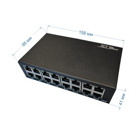 ST-ES161M (версия 2) Cетевой 16-ти портовый коммутатор,обеспечивает подключение сетевых клиентов со скоростью до 100 Мб/с.Имеет широкий диапазон питающих напряжений - от 5 до 13 Вольт, что позволяет применять его для решения различных задач при организации систем видеонаблюдения, Ethernet порты: 16х (10/100Мбит/с), Max.пропускная сп-ть: 100 Мбит/канал, Uпит(В): 5...13В (±10%), Стандарт сети: IEEE802.3u,IEEE802.3x,IEEE802.3ab, Скорость фильтрации/передачи пакетов: 10BASE-TX:14880 пакетов в сек./порт, 100BASE-TX:148800 пакетов в сек./порт, Коммутационная способность: 3,2 Гбит/с, Металл, От 0°C до +40°C, 158х95х41 мм
