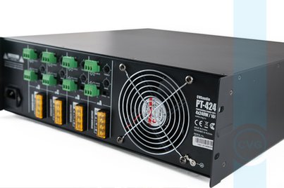 CVGaudio PT-4240 - профессиональный, четырехканальный, высококачественный усилитель мощности для систем трансляции фоновой музыки и речевого оповещения (Public Address). Модель имеет четыре балансных симметричных входа выполненных на разъемах EuroBlock. Если Вам необходимо подключить второй усилитель мощности или другое активное звуковое устройство с балансным входом к тому же источнику сигнала, Вы можете использовать линкующий выход Link out (Balance Out) раздельно для каждого из четырех каналов усилителя. Линкующие выходы выполнены также на разъемах EuroBlock. Усилитель может работать с тремя типами акустических систем – 100V / 70V / 4-16ohm на выбор (единовременное допускается подключение только одного типа акустических систем). В основном CVGaudio PT-4240 рекомендован для работы в составе 100V трансляционных линий. Оригинальная схематехника и качественные, тщательно подобранные компоненты обеспечивают отличное, музыкальное звучание и сводят негативное влияние трансформаторов в звуковом тракте к минимуму. Мощность CVGaudio PT-4240 – 4 х 240W. На задней панели усилителя имеется раздельно для каждого канала четыре двухполосных графических эквалайзера для корректировки высоких (10000Hz) и низкий (100Hz) частот. Эквалайзеры могут отключаться: имеют режим обхода – ByPass. Приходящие спикерные кабели фиксируются с помощью зажимов под винт и обеспечивают надежное крепление кабеля сечением до 2,5мм. На лицевой панели CVGaudio PT-4240 располагаются четыре регулятор громкости, селектор включения питания и светодиодные индикаторы режимов работы усилителя для каждого из четырех каналов (POWER – включение / SIG – наличие входящего звукового сигнала / PIC – индикатор перегрузки / PROT – индикатор режима защиты). Усилители мощности используются совместно с предусилителями или другими активными звуковыми устройствами выполняющими функцию предусилителя (аудио матрицы, звуковые процессоры и т.д). В каталоге CVGaudio это модели серий PTP, PA, PMP. Устройство имеет металлический корпус, лицевая панель выполнена из алюминия. Может использоваться как настольный прибор или устанавливаться в монтажную стойку – в комплект поставки входят два специальных надежных металлических кронштейна. Стандартная высота усилителя при установке в монтажную стойку – 3U. CVGaudio PT-4240 имеет все необходимые для подобных устройств виды защиты – защита от короткого замыкания в спикерной линии, защита от перегрева, перегрузки, защита по питанию. Используется постоянное активное охлаждение радиатора транзисторов выходного каскада усилителя с забором воздуха через дополнительные вентиляционные отверстия на лицевой панели устройства. Все это обеспечивает качественную, стабильную и бесперебойную работу CVGaudio PT-4240 в течение долгого времени.