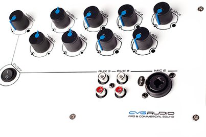 Первый микрофонный вход, первый линейный вход, линейный выход, конекторы для подключения акустических систем и dip переключатели для активации фантомного питания и приоритетов на микрофонных входах находятся на внутреннем нижнем фальшь дне усилителя, которое закрывается внешней декоративной металлической накладкой. Также на внутреннем дне расположен вход для подключения кабельного IR сигнала управления модулем источника звука с помощью внешней системы управления, например CVGaudio UNICORE.