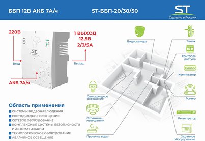 Блок бесперебойного питания ST-ББП-20, потребляемая мощность по сети 220В: 32 Вт, от 150В до 243В 50Гц, 7А/ч, максимальный ток нагрузки общий: 2А, индикация, защита от короткого замыкания, -5°С до +45°C, влажность воздуха не более 85% при температуре +25°C