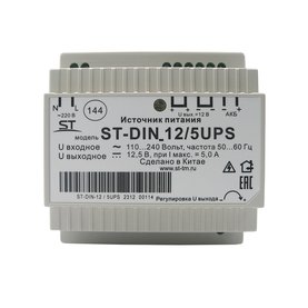 ST-DIN 12/5UPS Стабилизированный источник питания на DIN-рейке с функцией подключения АКБ для питания аппаратуры напряжением 12В, Мощность по цепи нагрузки 12 Вольт (при максимальном выходном токе: 60Вт, 12,5В, Защита выхода от КЗ с восстановлением нормального режима работы после устранения проблемы,защита АКБ от глубокого разряда,регулировка выходного напряжения, Пластик, -10...+45°C